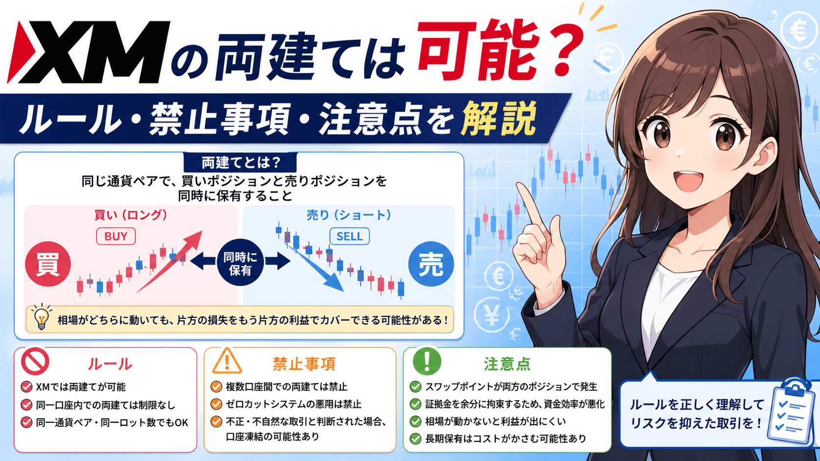 XMの両建ては可能かを解説。同一口座内での両建てルール、複数口座や他業者との禁止事項、ゼロカットとの関係、メリット・デメリットや注意点まで2026年最新情報でわかりやすくまとめました。